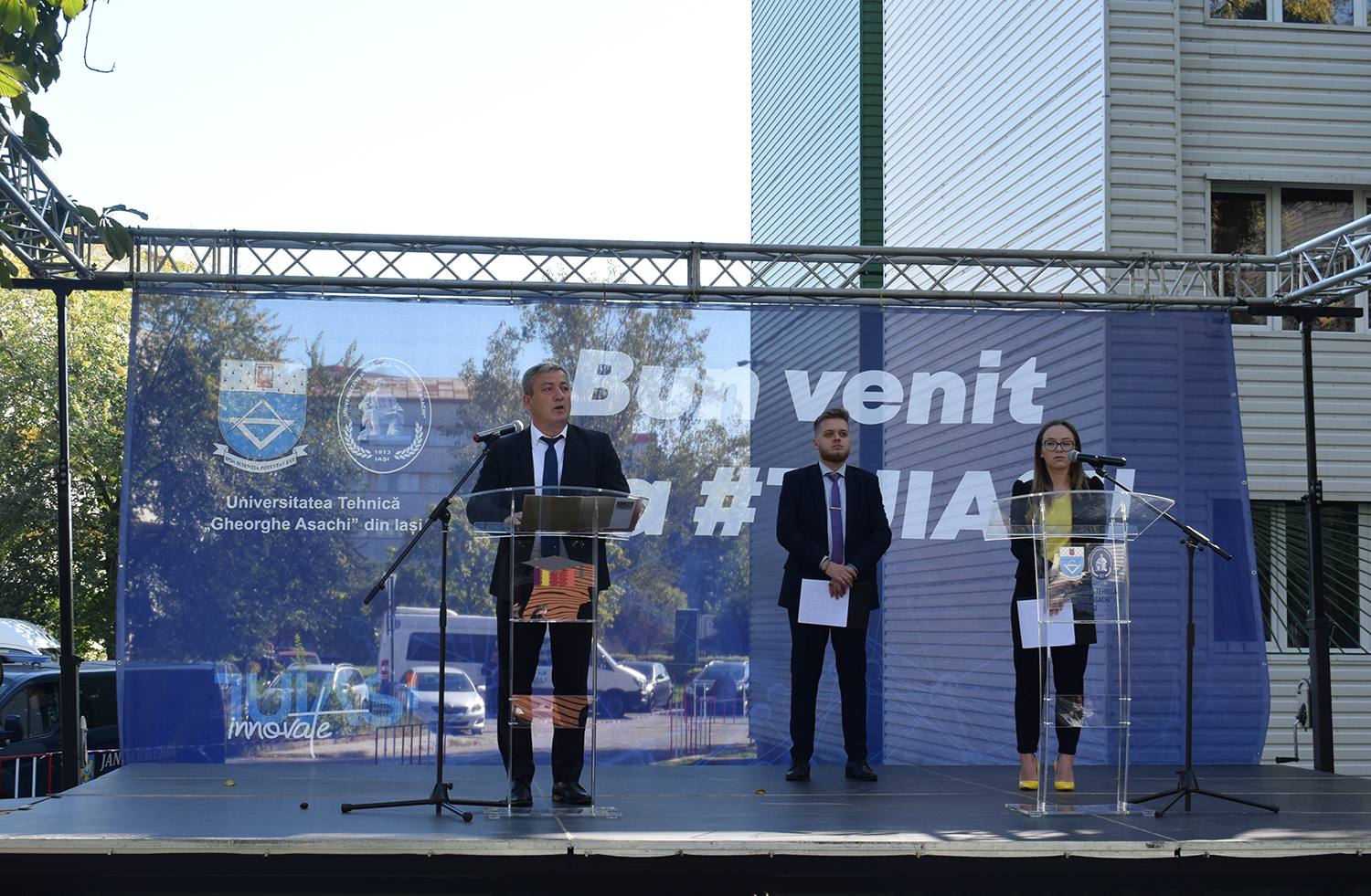 Moderatorii ceremoniei au fost doi studenți ai universității: Teodor Anița și Diana Asoltanei, care, după redarea imnului de stat al României și a imnului Gaudeamus, au dat cuvântul rectorului TUIASI, prof. univ. dr. ing. Dan Cașcaval. În discursul său, acesta a insistat asupra faptului că spiritul universitar trebuie să depășească teama pandemiei, iar măsurile de siguranță trebuie să fie respectate la maximum, pentru ca activitatea să se desfășoare cât mai mult față în față.