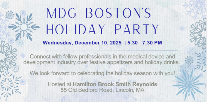 MDG Boston vă invită la evenimentul „MDG Boston’s Holiday Party” organizat onsite în SUA pe 10 decembrie 2025 și care se adresează profesioniștilor din industria dispozitivelor medicale și celor interesați de dezvoltarea acestora, atât celor din mediul academic, cât și celor din mediul privat.