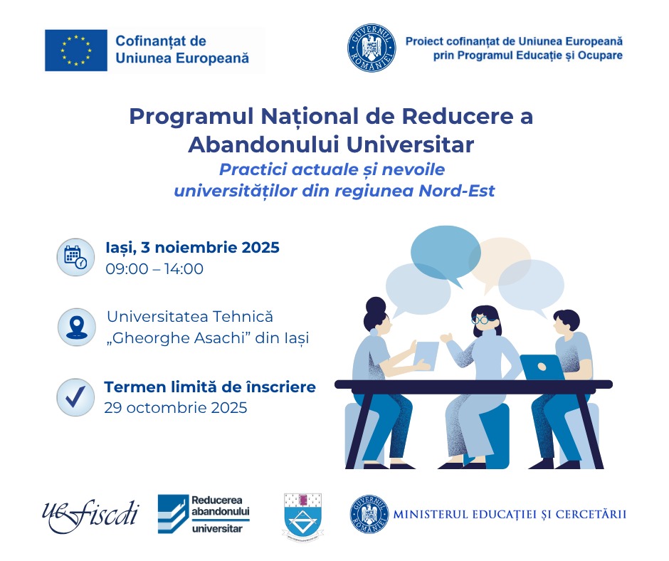 Iași, 3 noiembrie 2025 – Universitatea Tehnică „Gheorghe Asachi” din Iași (TUIASI) va fi gazda unui eveniment regional dedicat consolidării comunității de experți în domeniul prevenirii și reducerii abandonului universitar. Evenimentul va reuni experți, reprezentanți ai universităților și ai federațiilor naționale studențești, pentru a dezbate provocările, nevoile și bunele practici în combaterea fenomenului de abandon în învățământul superior.
